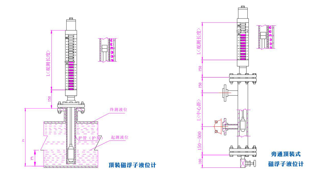 UHC系列顶装式磁浮子液位计可与液位报警控制开关、磁性远传变送器配套使用。与液位报警控制开关配套使用可实现液位的报警和液位的控制功能;与磁性远传变送器配套使用可输出4~20mADC标准信号,实现远距离检测、指示、记录与控制。