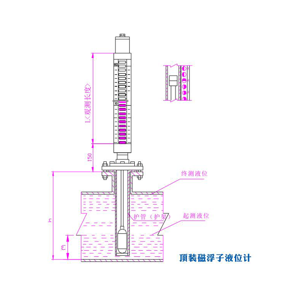 UHC系列顶装式磁浮子液位计可适用于顶部开口的储罐的液位检测。该产品带有护管插入储罐内,护管起到了导向作用,同时又可保护浮球的导杆不受进料的影响,产品性能可靠。